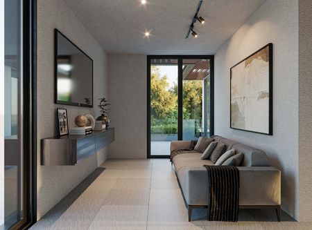 Área Exterior: Cine al aire libre, kids park, área de asadores, rooftop bar, alberca con canal de nado y kids pool, fuente monumental, estacionamiento y senderos verdes rodeados de naturaleza.